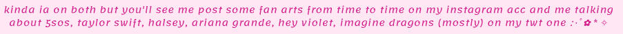 | ⋆ screaming and rting on the tl are my speciality. i lose my mind a lot over too many groups at the same time | ⋆ engage in fanwars (hate them a lot) |